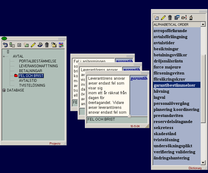 Textsnuttar bygger upp en artikeldatabas. Ur varje artikel analyserar man ut nyckelord som ger skribenten uppslag. En avtalstext skapar man genom att låta ett hierarkiskt projekt peka på fritt valda artiklar alternativt helt ny text. Det finns dessutom visst stöd för att visualisera med kartor. En skärmdump ser ut på följande sätt: