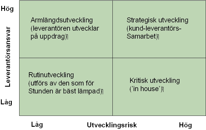 Man bör också fråga sig i vilka situationer man bör involvera leverantörerna i utvecklinsarbetet. Holländarna Finn Wynstra och Ten Pierick har tagit fram en enkel analysmodell, som är en klassisk kvadrantanalys. De ställer parametrarna leverantörsansvar och utvecklingsrisk mot varandra på följande sätt: