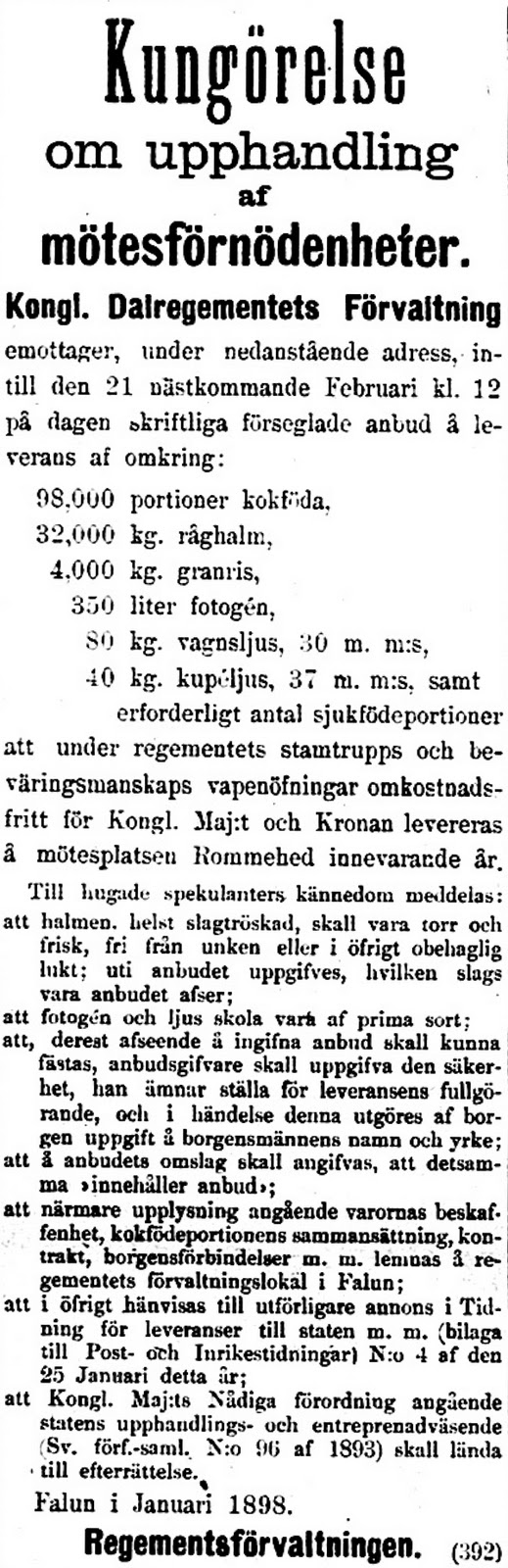1893-års förordning är i flera avseenden modern, här finns mycket av de regler som vi har idag. En företeelse som skiljer sig från dagens är att man reglerar många avtalsvillkor i detalj. Det fanns alltså inte samma frihet för upphandlaren att själv sätta upp villkor. Annonseringskravet är förstås lika starkt, vilket man kan se i många dagstidningar, exempelvis denna annons i tidningen Dalpilen 1898: