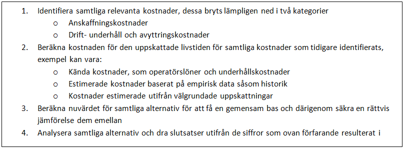 En lämplig metodik för att genomföra en livscykelkostnadsanalys inkluderar följande fyra steg: Klicka på bilden för att förstora.